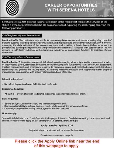 Chief Engineer / Security Jobs in Serena Hotel Quetta 2026 March / April Apply Online Latest