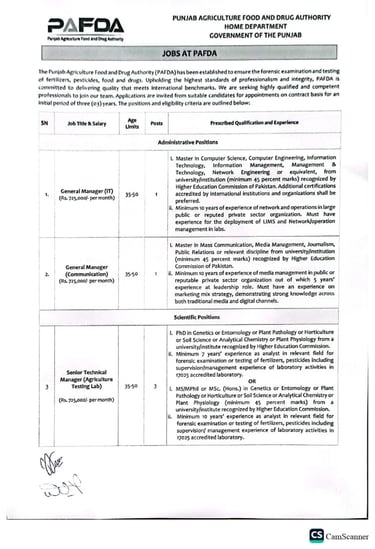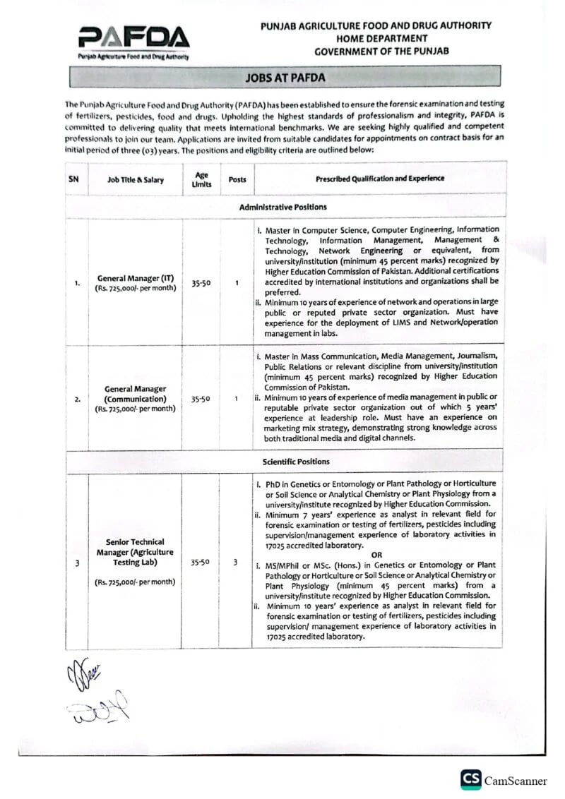 Punjab Agriculture, Food, and Drug Authority(PAFDA) has announced a BPS-16 Senior IT Manager with a minimum 45% marks from a HEC-recognized university.